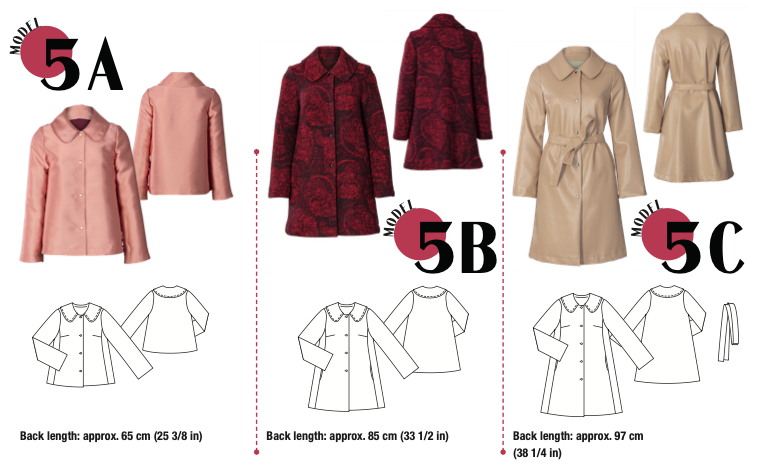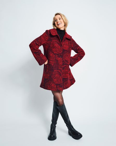 B: Cool and cuddly: Slightly flared wool jacket with Peter Pan collar and poppers. The look is particularly casual with black (imitation) leather pieces. But the daring also wear it with rose hues, lilac and purple.