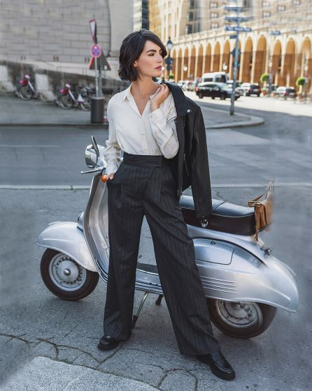 Recommended fabric: Trouser fabrics made of wool or blends. Original fabric: Stretch wool blend with lurex pinstripes.