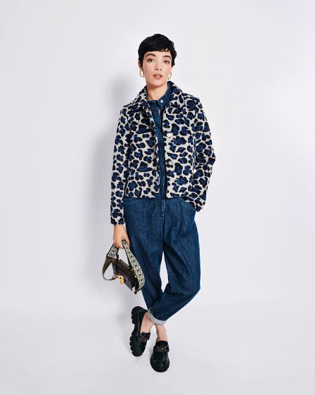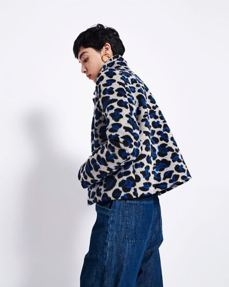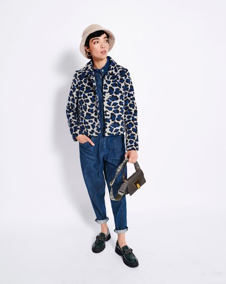 A: Blue leopard print? Why not?! As the cut of this wool jacket is simple and without frills, the pattern can be as wild as you want. The ideal âouter layer' for jeans looks!