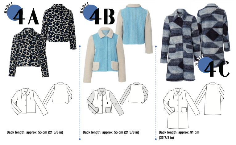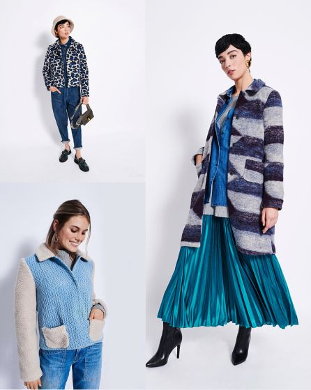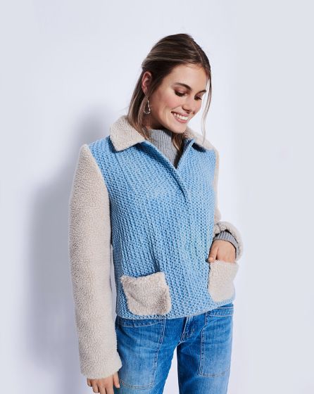 B: A different sort of jeans jacket: The denim fabric with an unusual texture, a cropped cut, and sleeves, pockets and collar in plush all add up to a head-turner.