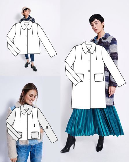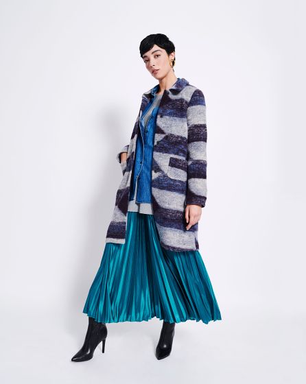 C: Just as impressive here in the elegant âextended version'. The grey and black coat made from a fluffy material - with poppers and patch pockets.