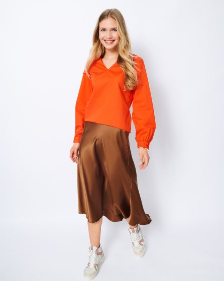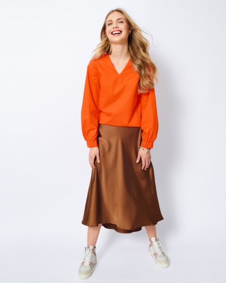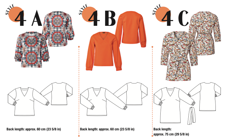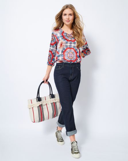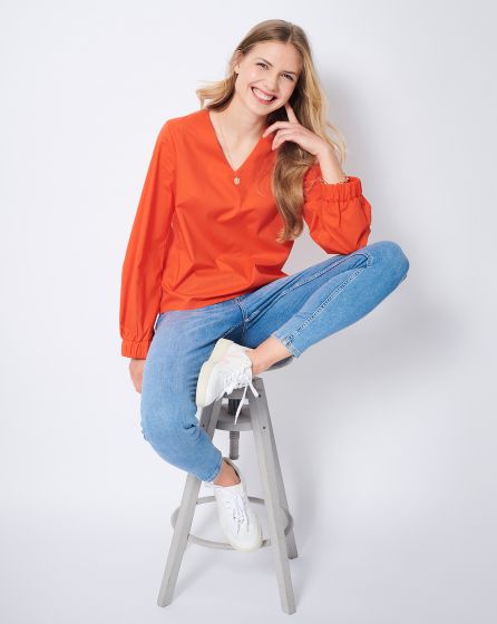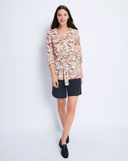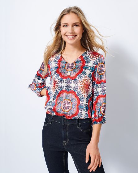 A: Casual blouse with V-neckline and elastic at the sleeve ends in patterned peace silk. The print adds a Seventies touch to the elegant piece. For an in period boho hippie look, add a maxi skirt and flats or flared jeans and platform boots. A floppy hat tops it off.