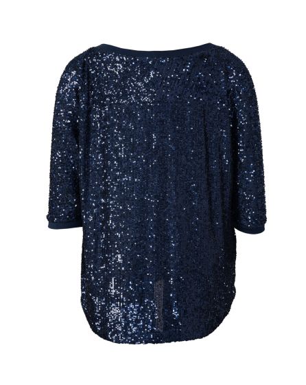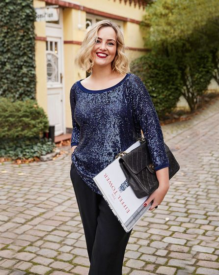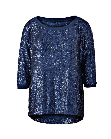 A:French women are very good at making ultra-glamorous pieces look casual and nonchalant. And with this top, you can fly your French, too! Narrow bands finish the sleeves and neckline of this very relaxed piece, and the sequinned fabric transforms it into an authentic WOW! piece.
