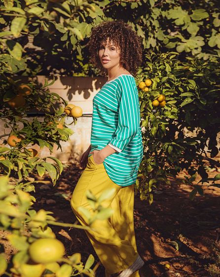 B:Super casual, easy and that's why its so good: The basic shirt with solid-coloured wristbands has integrated sleeves - the fashionable stripe pattern is a natural phenomenon.