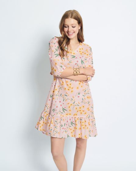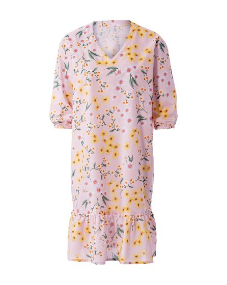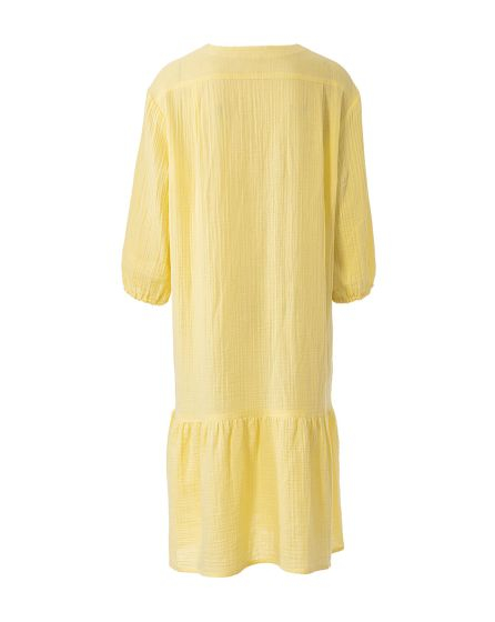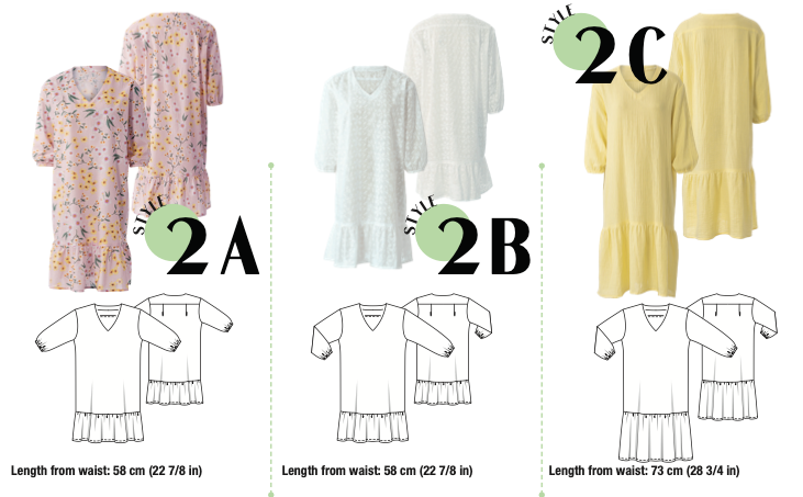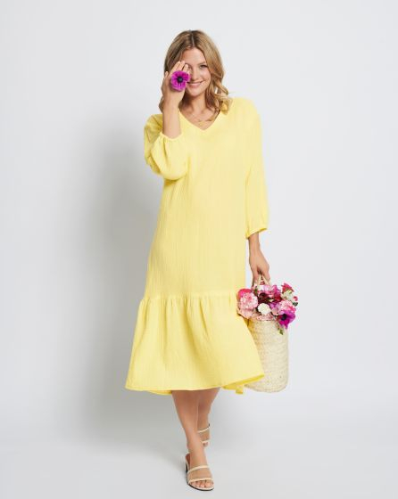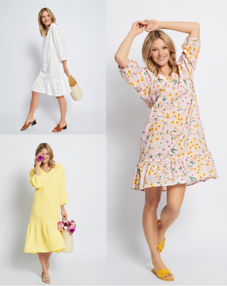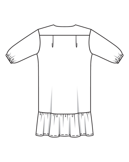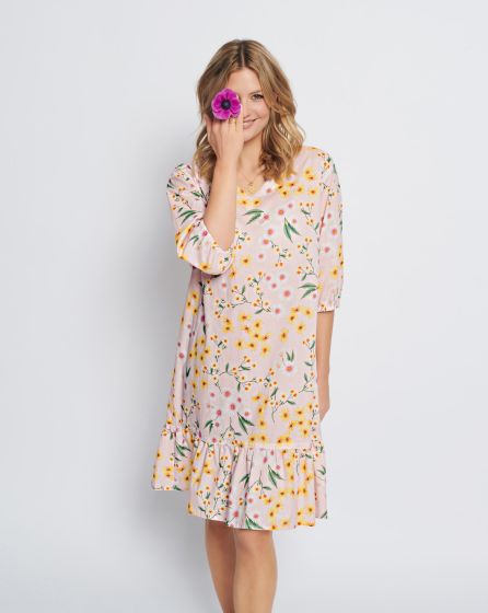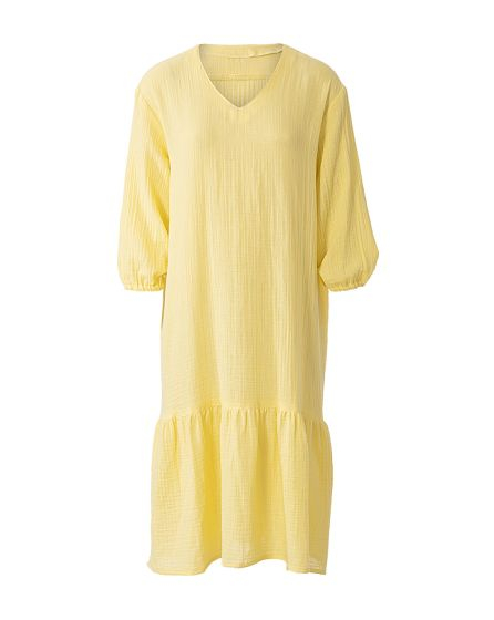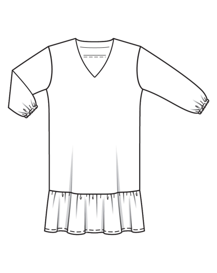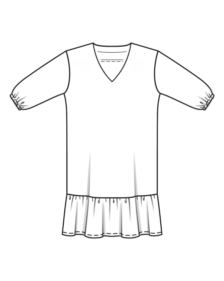 A: Love at first glance: dress with an airy cut, a short ruffled hem, V-neckline and 3/4 sleeves with elastic at the ends.