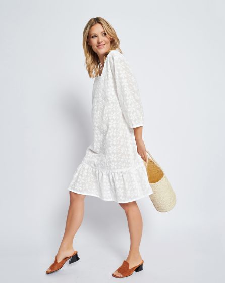 B: In this dress, you are well-dressed everywhere you go this summer. Shift made from white cotton lace with 7/8 sleeves and a ruffled hem that flutters around the knees.