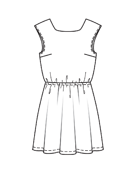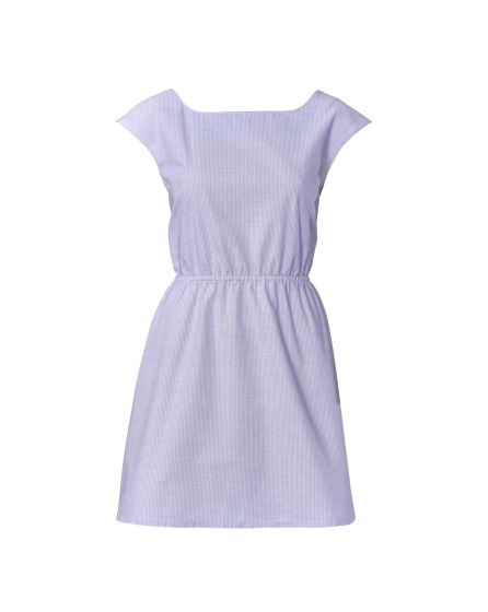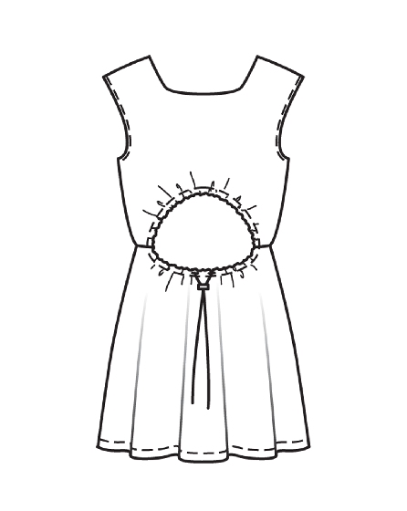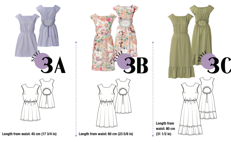 A : Drop shoulders, elastic at the waist and a surprising cut-out at the back (also see model 3 B), which can be adjusted with a casing and elastic cord...this mini dress in a linen look is a simple yet extravagant summer favourite.