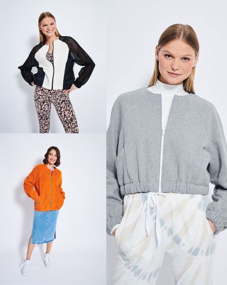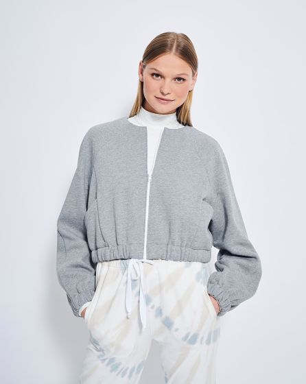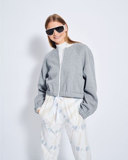 A: Cropped is the latest trend! This short bomber jacket in organic grey sweatshirt fabric with a zip, pockets and elastic at the sleeve ends and hem shows just how cool the style is.