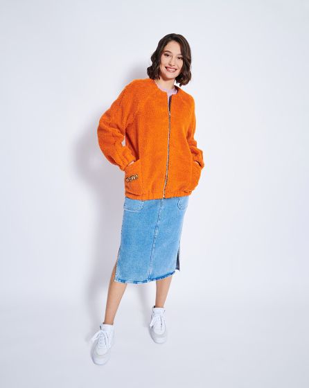 C: » PLUSH JACKET Hip-length and in fruit drop colours - another hit: a blouson in cuddly plush with a patch sewn onto the pocket. WOW!
