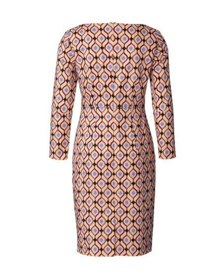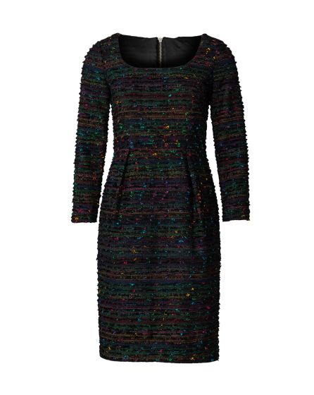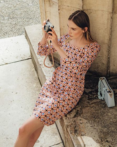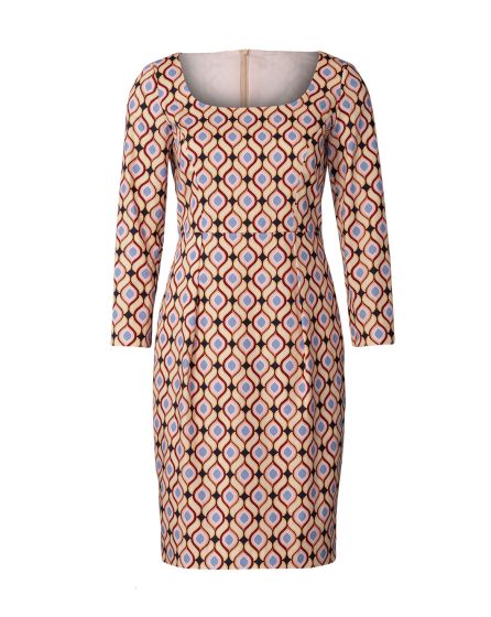 A: Business dress for an office highlight: thanks to the princess seams and darts, the cut fits perfectly. And the (not too) deep neckline and bold print will make it