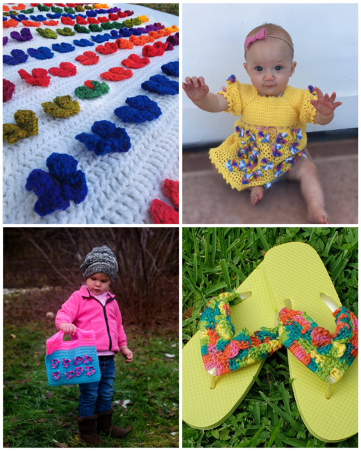 * Lovely baby girl's crocheted dress pattern with 3-dimensional butterflies flitting across the skirt in Baby Bee Sweet Delight yarn. Small buttons on the back and purple ribbon accents at