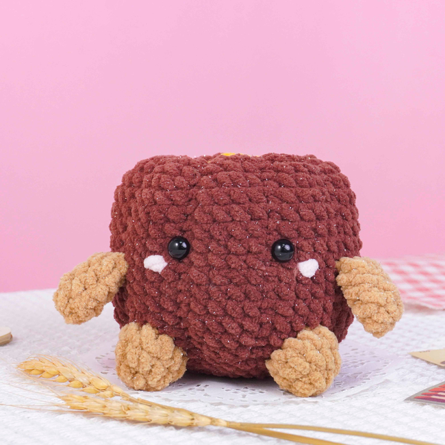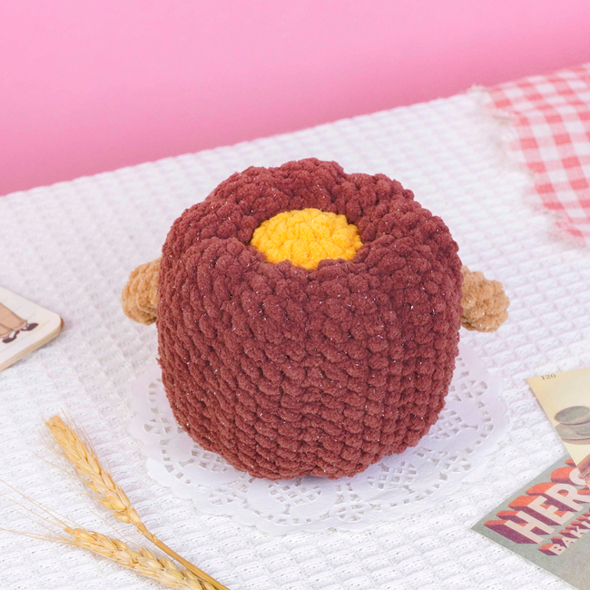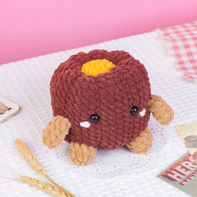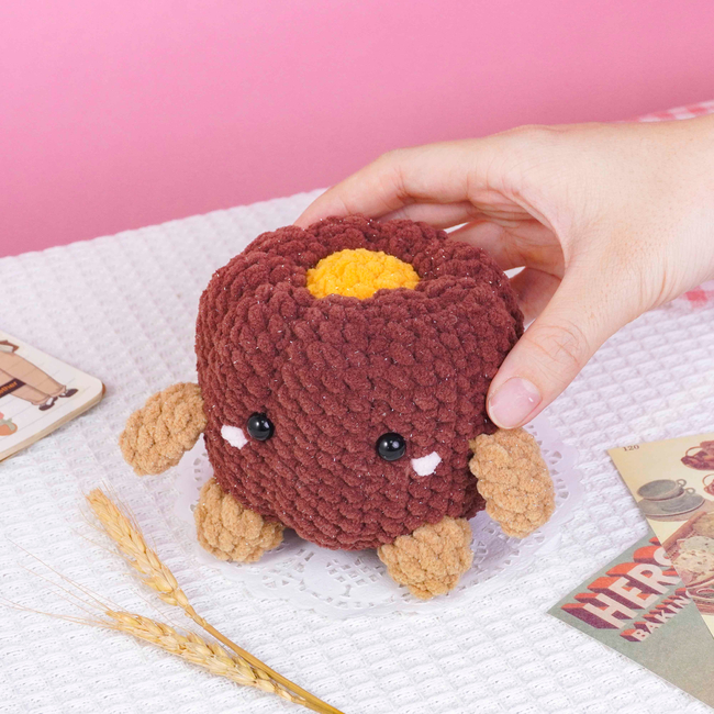 To make Calene Cake Crochet Pattern you will need: Color: Dark brown, light brown, dark yellow, and pink, Stitch markerSewing needleScissorsFiberfillPlastic safety eyes (9mm x2)Hot glue gun. Tools required: 4mm (G/6) Hook.