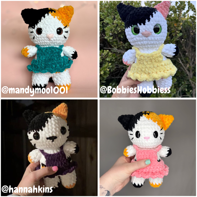Head, body, legs, arms, and tail color (1/4 of a skein of parfait chunky by Premier Yarns in color white) Head/body patches, feet, hands, tail, and ears color (less than 1/4 of a skein of parfait chunky by Premier Yarns in color black) Head/body patches, feet, hands, tail, and ears color (less than 1/4 of a skein of parfait chunky by Premier Yarns in color maize) Dress color (less than 1/4 of a skein of toucan by Hobbii in color cotton candy) Face detail color (small amount of any pink worsted weight yarn) Face detail color (small amount of any black worsted weight yarn)