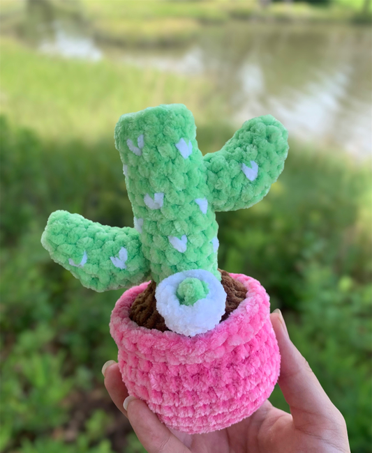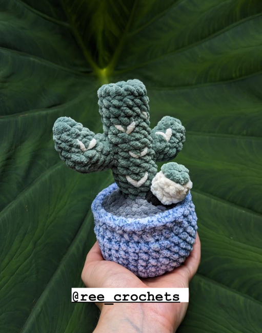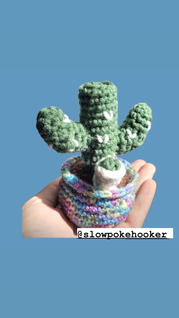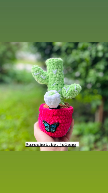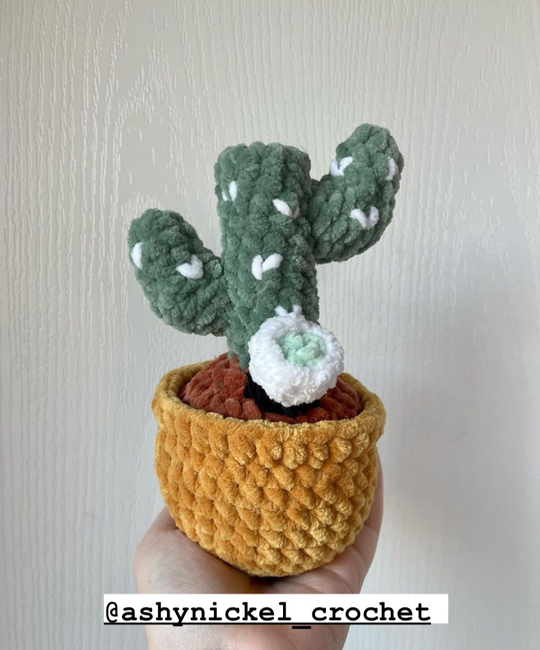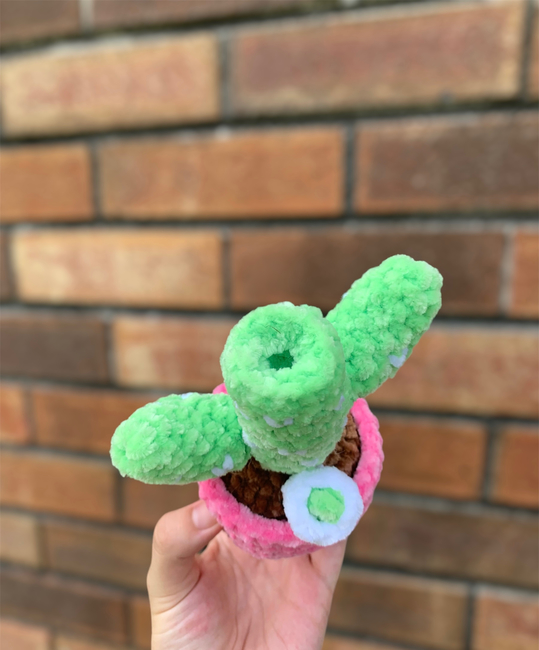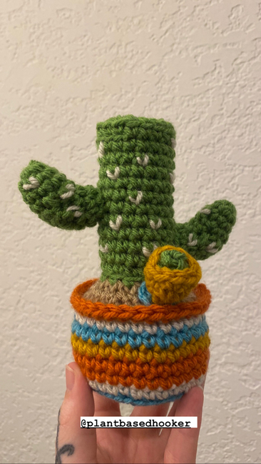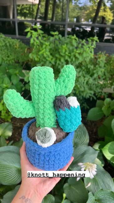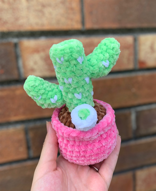 About 30 yards of Just Chenille for the pot About 8 yards of Just Chenille for the dirt About 25 yards of Just Chenille for the cactus About 2 yards of Just Chenille for the cactus details About 2 yards of Just Chenille for the o-ring About 2 yards of Just Chenille for the bowl piece About 1 yard of Just Chenille for the nug