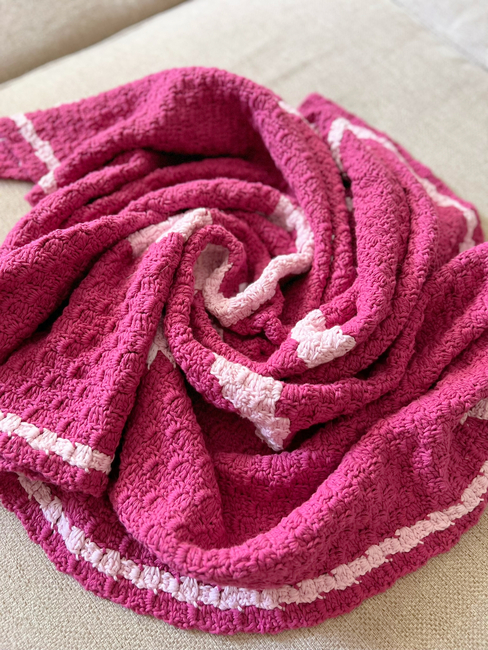 This pattern is 53x75 squares and uses two colors of your choice, white, and an H/8 - 5.00mm hook.