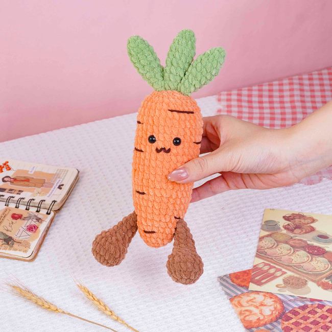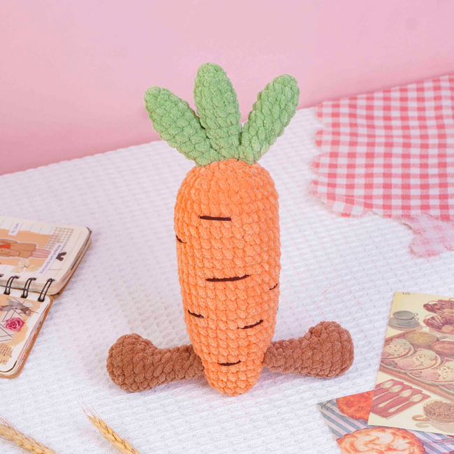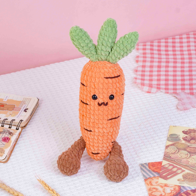 To make Carrot Crochet Pattern you will need: Color: Orange, brown, green, and a small amount of dark brown yarn - weight 2, Stitch markerSewing needleScissorsFiberfillPlastic safety eyes (8mm x2). Tools required: 4mm.