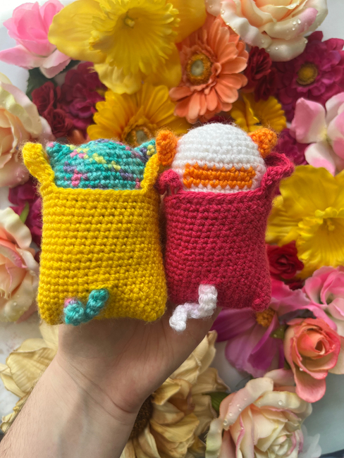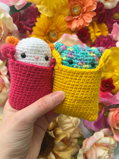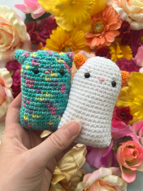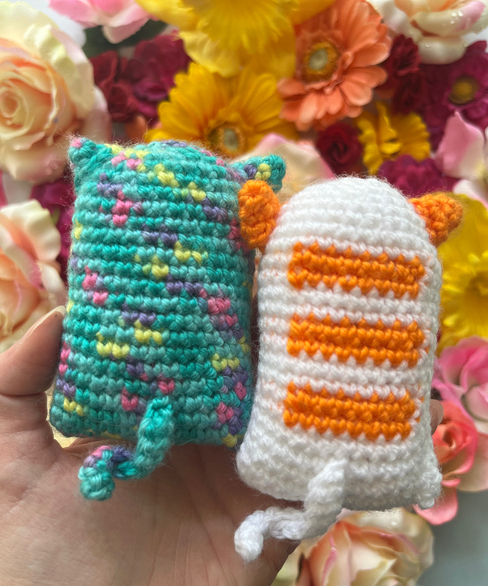 Welcome to the pattern for my Carrying Cats! Thank you so much for your interest in my pattern. This is an advanced beginner pattern, as it consists of only the most basic stitches, but may require adjustments that could be too complex as a person's first- or second-ever crochet pattern. I was inspired to make the Carrying Cats based on a knitting pattern I had seen but I had to write my own pattern since I don't know how to knit. I hope that you enjoy this advanced beginner-friendly amigurumi pattern as much as I have enjoyed writing and using it.