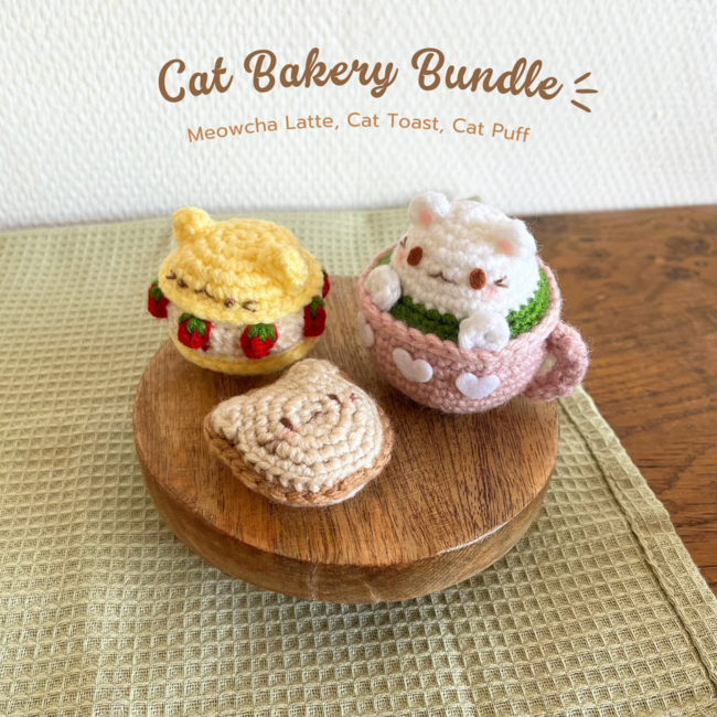 This bundle includes my Meowcha Latte, Cat Toast & Cat Puff Pattern.