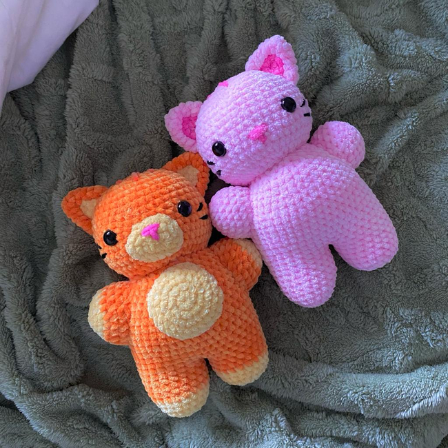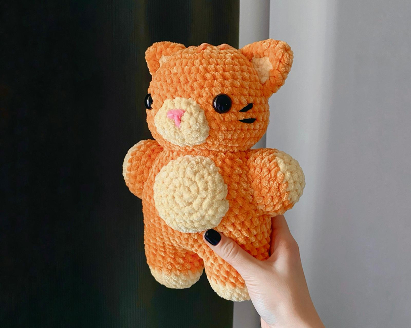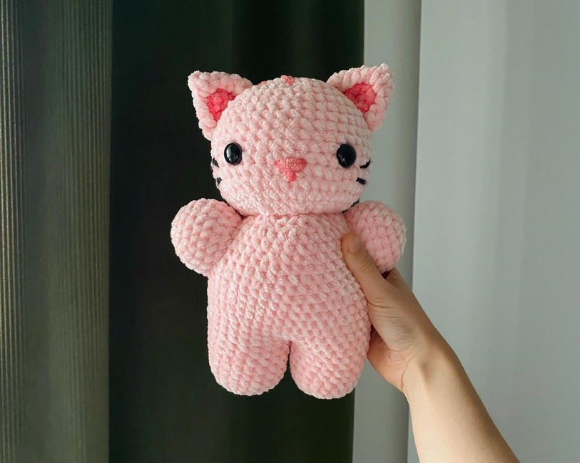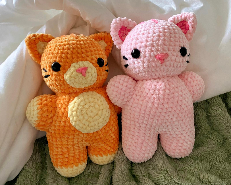 This pattern includes step by step instructions to create your own cat plushie. Feel free to personalize it by choosing 3 colors you like. If you want to make it in one color, just skip the color change instructions.
