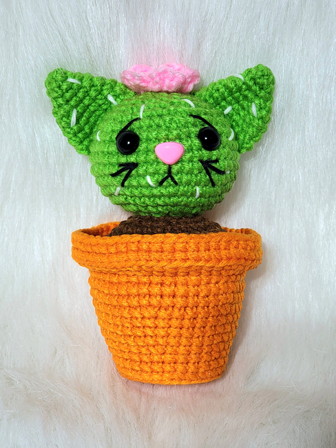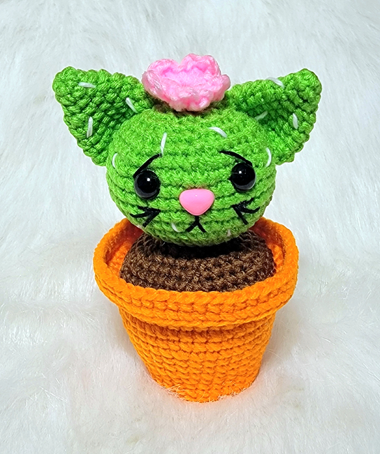 This pattern uses basic amigurumi techniques, including the magic ring, single crochet, increases and decreases, and simple color changes. Some sewing is required to assemble Catcus, including attaching the ears, pot, and facial details. Embroidery is optional for those who prefer to stitch the face instead of using safety eyes and a nose.
