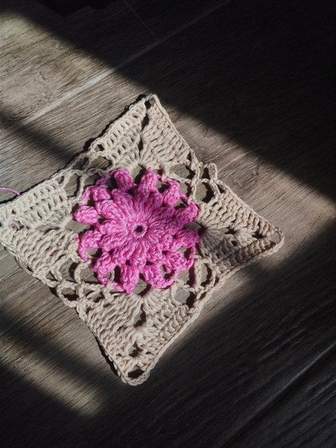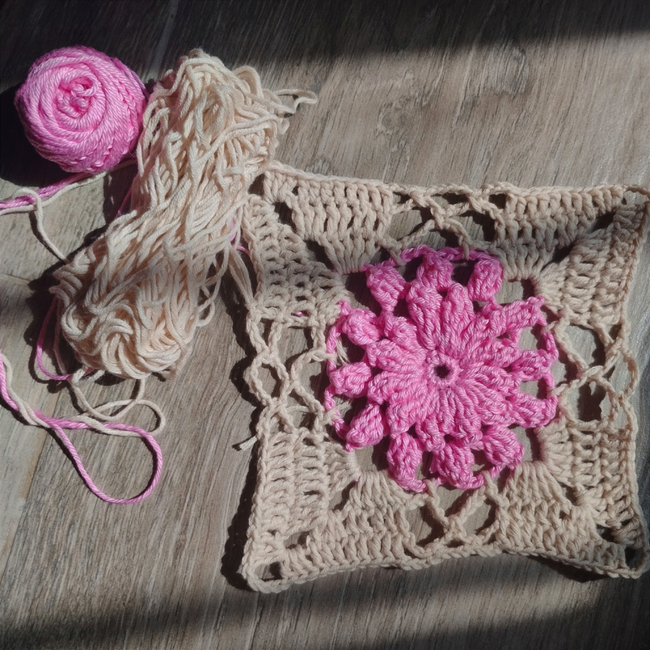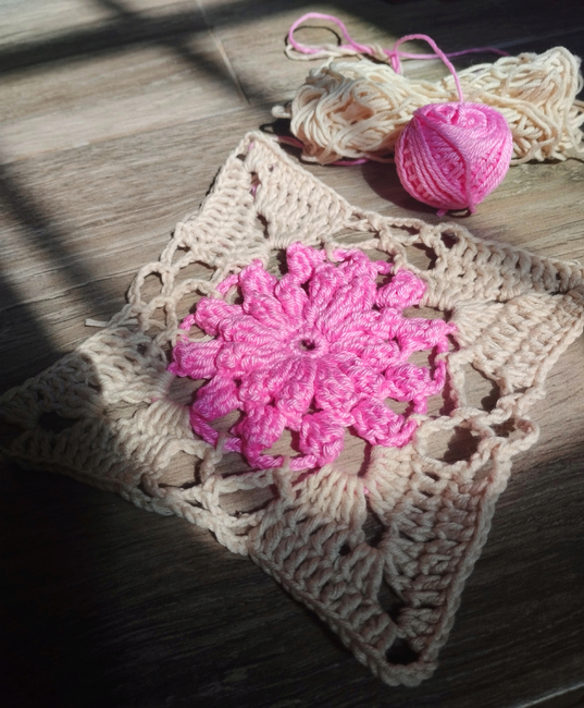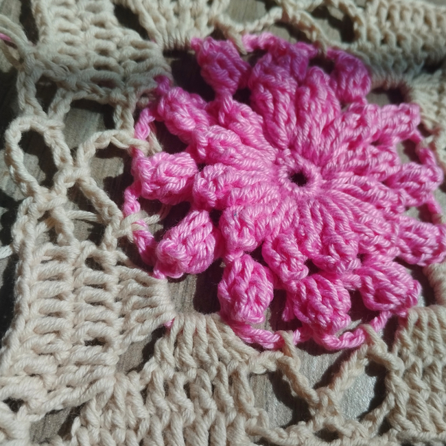 Chantilly is a cute granny square that is made up of lace and motifs that frame and highlight a beautiful central flower that stands out for its beauty and volume, giving a special and different touch to the classic granny square and making it unique to use in various projects.