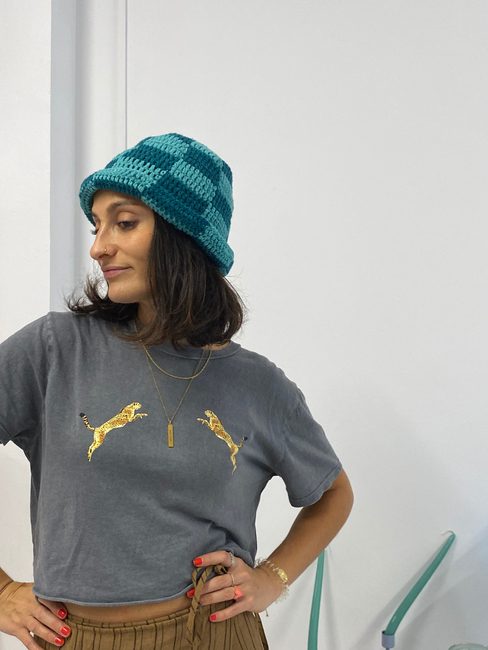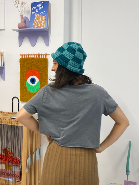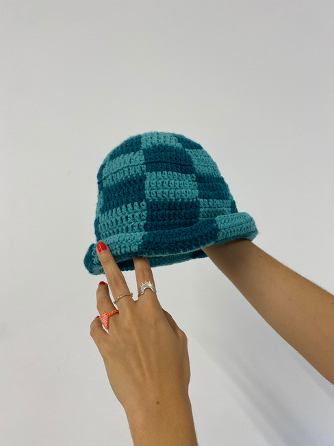 Patrón para tejer tu propio bucket hat de cuadros. Técnica tapestry.
