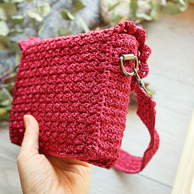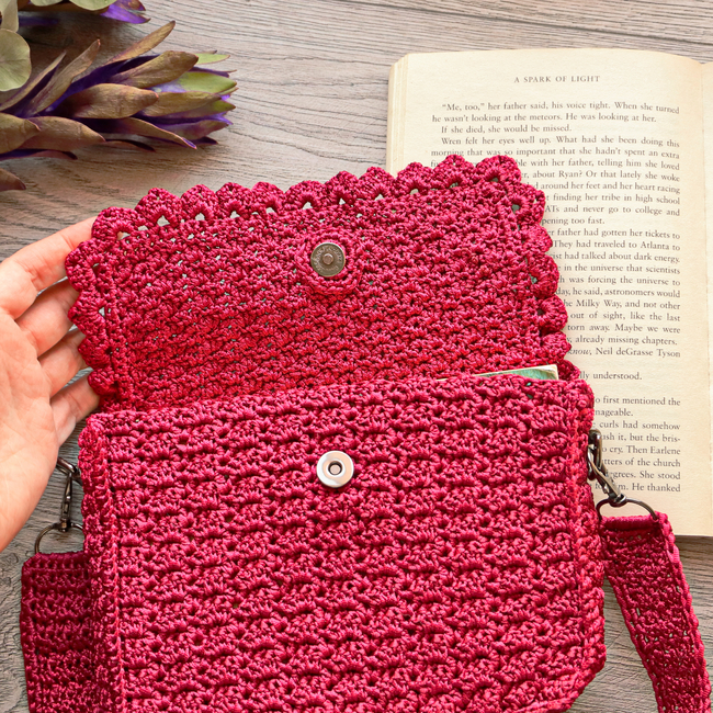 It's structured but still soft to the touch, simple in shape but with just enough detail to keep it interesting. The leafy flap became my favorite part somewhere along the way, like a small finishing ritual at the end of each use. It's the kind of project you make once, then catch yourself wondering how it would look in every other color sitting in your yarn stash.