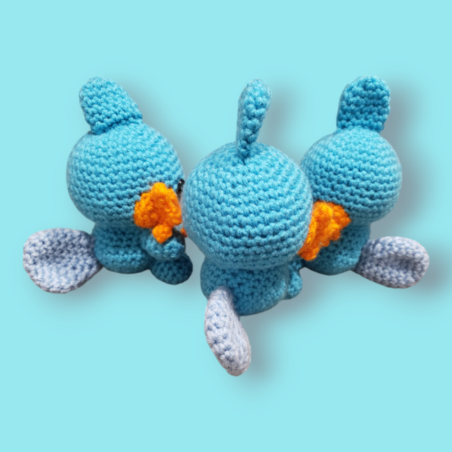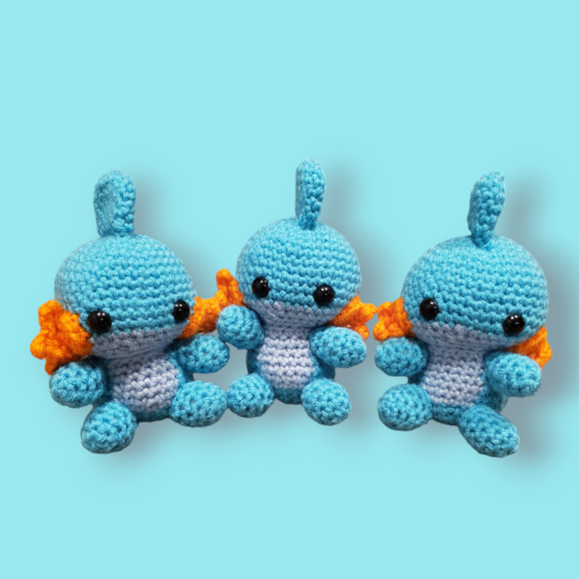 Crochet this happy water-type Pokémon: Mudkip! Mudkip is from Pokémon Ruby, Sapphire, and Emerald. Perfect size for a small gift or a stocking stuffer!