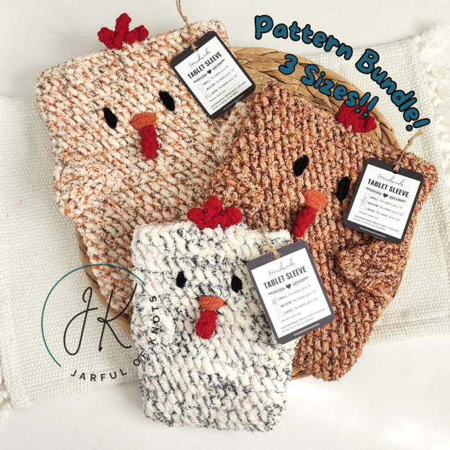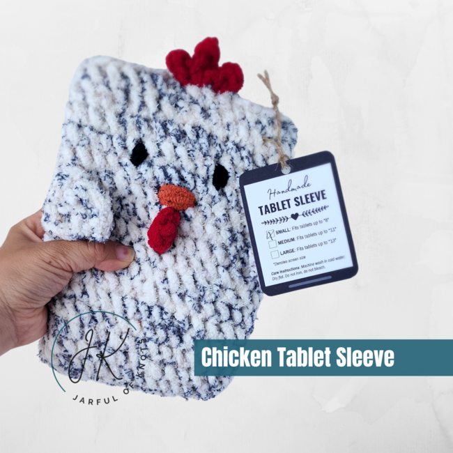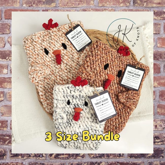 Chicken Tablet Sleeve 3 Size Bundle is a Beginner Crochet pattern designed by Jarfulofknots for making an Accessories. The printable display tags featured in photos can be purchased separately, please DM or through my Etsy: Jarfulofknots.Etsy.Com. Get all 3 sizes for my chicken tablet sleeves in 1 bundle! This pattern is for my easy crochet chicken tablet sleeve....