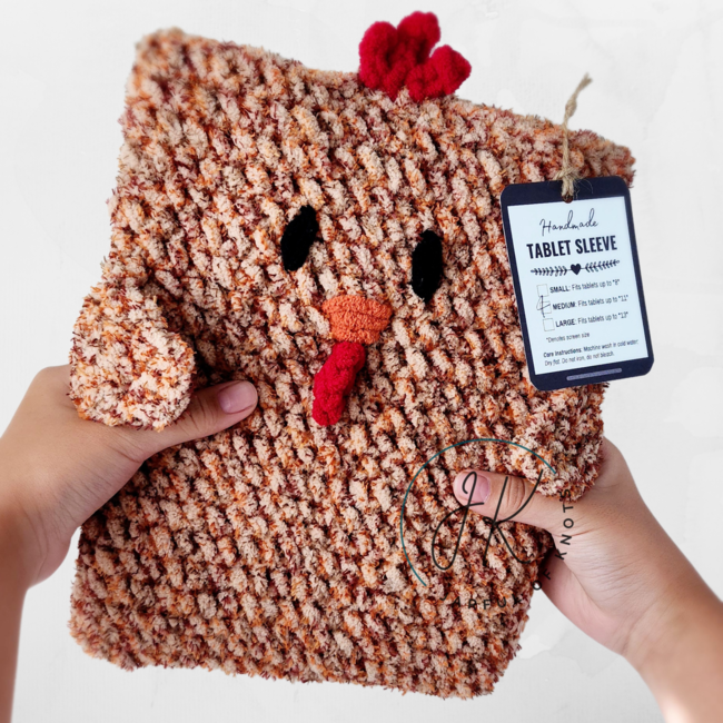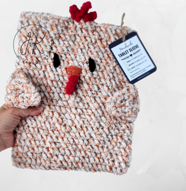 This pattern is for my easy crochet chicken tablet sleeve. Instructions are provided for 3 sizes: small, medium, and large.