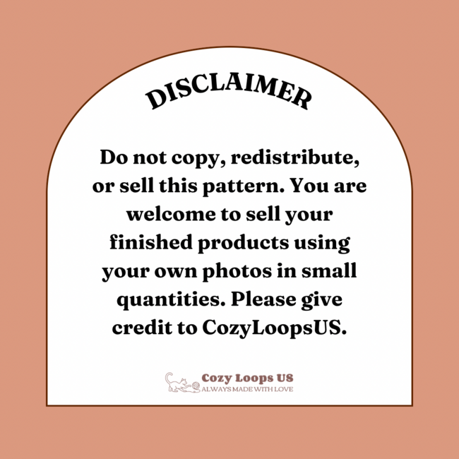 Hi thank you for trying my pattern! Please do not sell, redistribute, or copy this pattern. You may sell your finished items using your own photos in small quantities. Please tag @cozyloopsus so I can see your creations!
