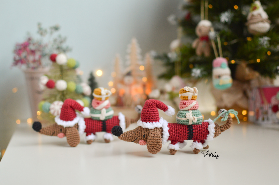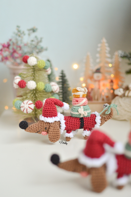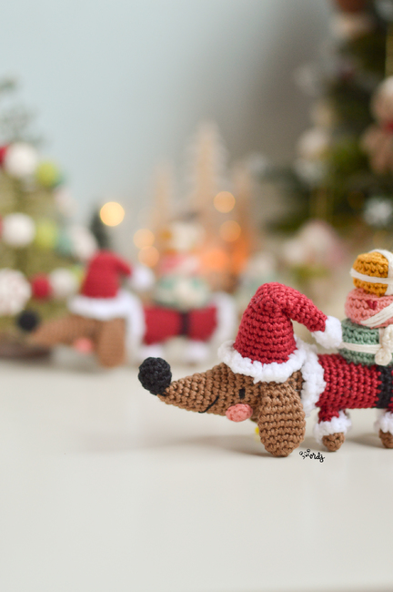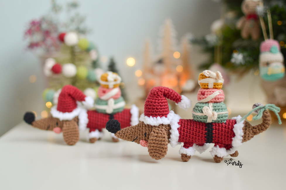 pattern dachshund dressed as Santa Claus amigurumi. Crocheting Guide to knit a Santa amigurumi dog.