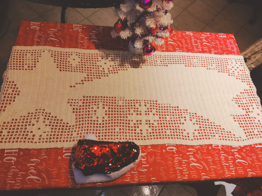 This is a filet crochet pattern with the image built into a graph/chart from which you make the runner, a Row by Row file and a Color Blocks file