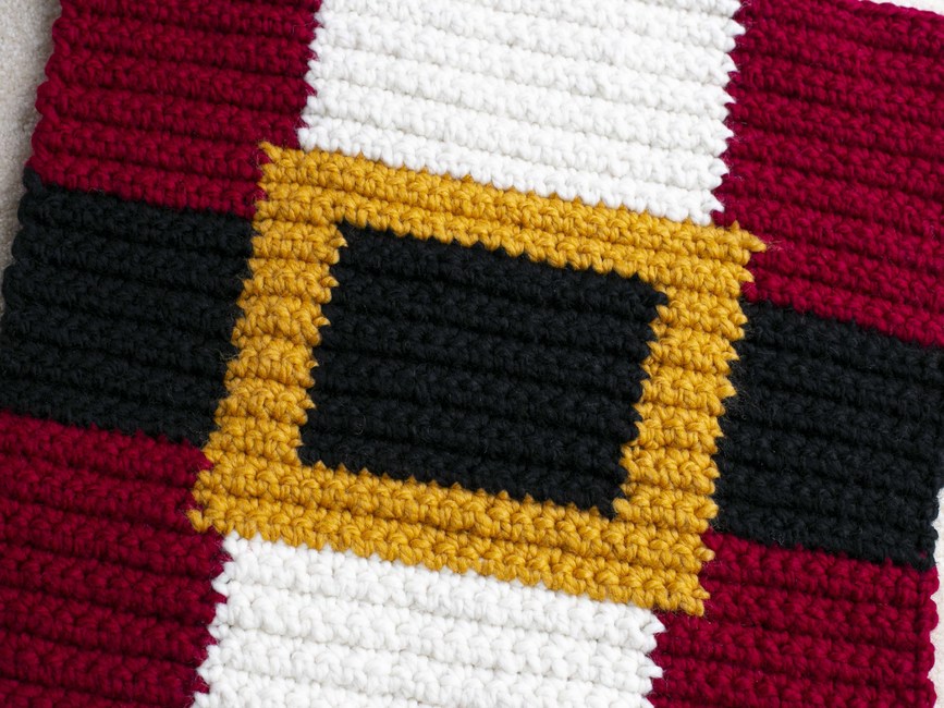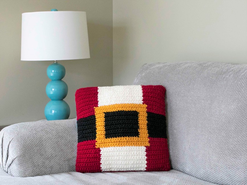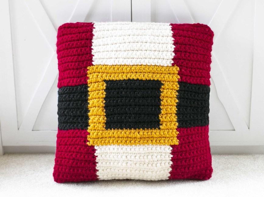 Our Santa belt Christmas pillow pattern is the perfect addition to your handmade holiday decor this Christmas. The soft and chunky yarn makes this a quick project.
