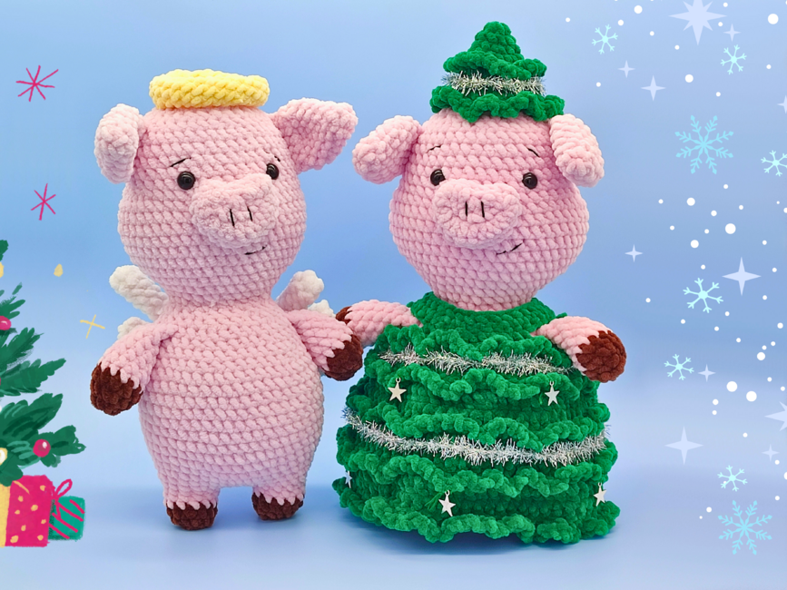 Introducing my Christmas Tree Pig and Angel Pig Bundle - interactive crochet patterns for two low sew Amigurumi Christmas Pig mashups.