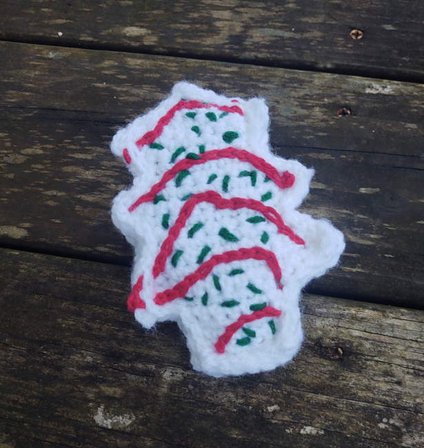 This little cake is made by making two cute tree shapes, then attaching them in the middle and doing a bit of surface crochet for the decorative parts!