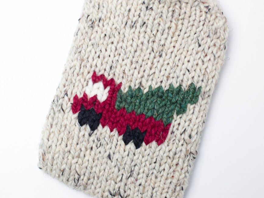 The cover is knit in the round. The tree and truck are added on afterwards using a duplicate stitch.