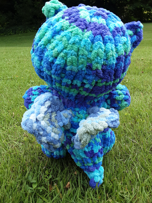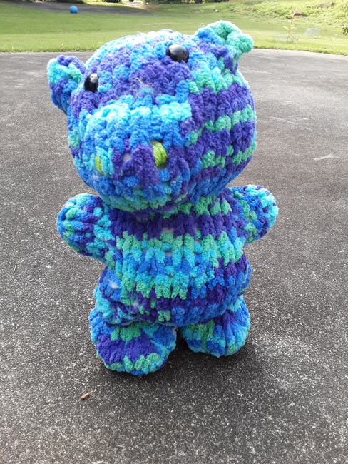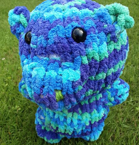 To make Chunky Dragon you will need: Bernat blanket yarn in color @QOcean Shades@Q, @QSpring green@Q scrap yarn., Yarn needle, Stuffing, 14 mm safety eyes. Tools required: 8 millimeter DPNs.