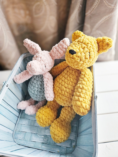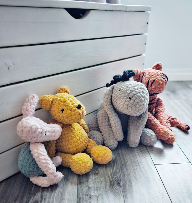 These amigurumi designs are based on the original Winnie-The-Pooh characters from the 1926 children's book by English author A. A. Milne and English illustrator E. H. Shepard.