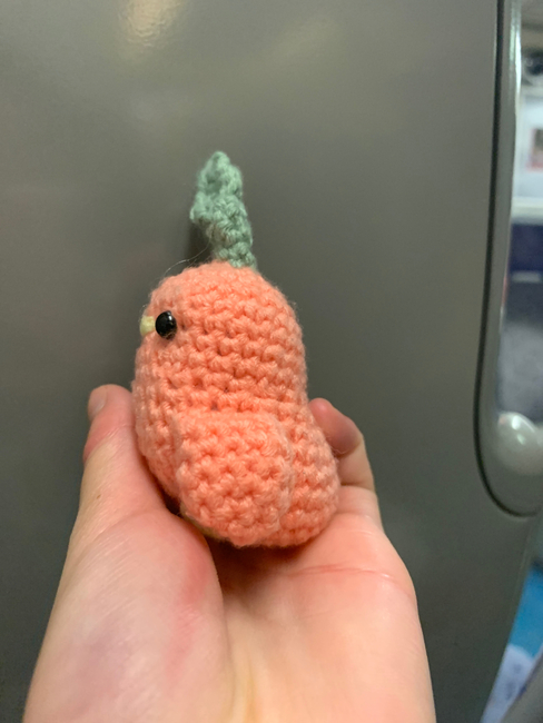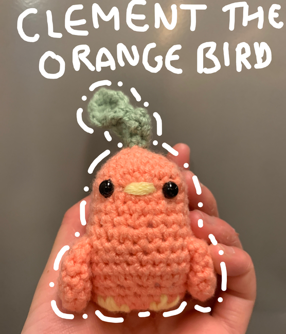 Meet Clement the orange bird! He is part of a little duo with Martin or Marty the little lemon chick. This pattern was created for a fruit themed collab. This is a low-sew pattern as you only have to sew leaves onto the stem
