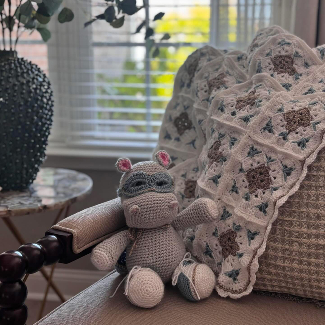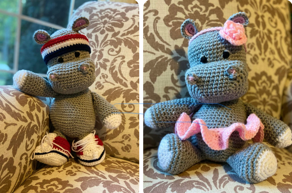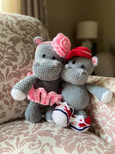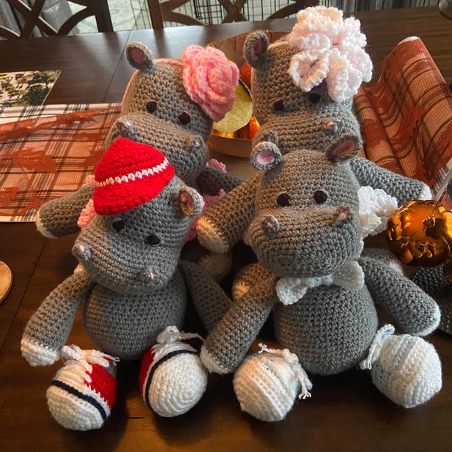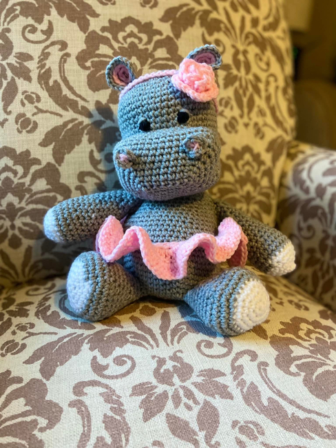 The free amigurumi hippo pattern can be found at https://www.tarturumies.com/2017/07/21/amigurumi-pattern-the-hippopotamus-melman-and-his-friend-pi/. Pattern shared with permission.