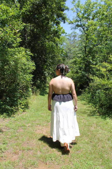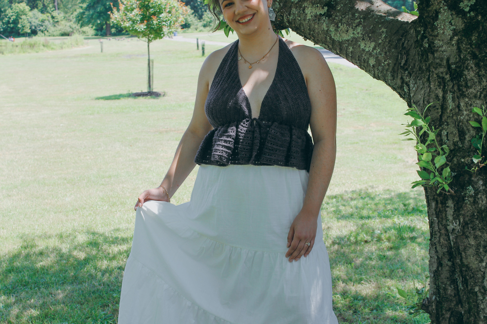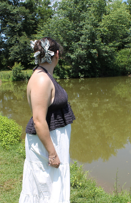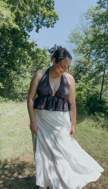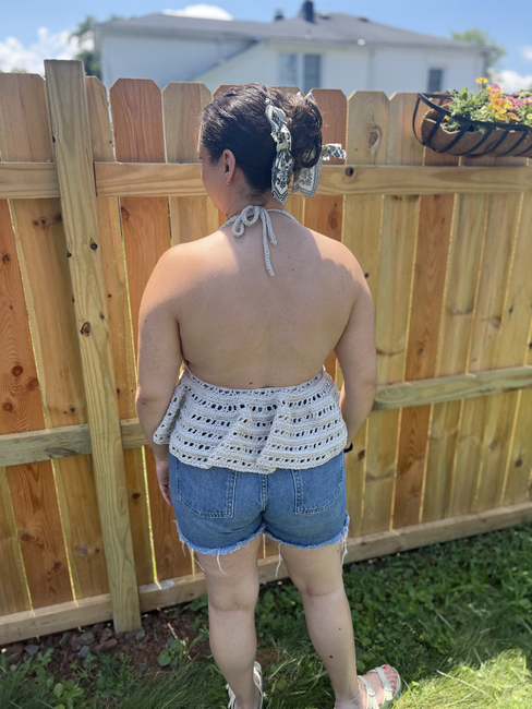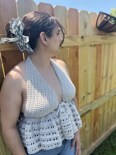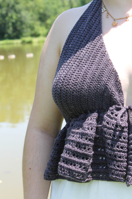 This pattern is fully customizable to your measurements, ensuring a perfect fit every time. The vest is worked in three piecestwo cups and a ruffled bottomwith ties added at the neck and front for adjustability. The halter-style neckline and tie-front closure give it a light, airy feel, while the ruffled hem adds a feminine touch.