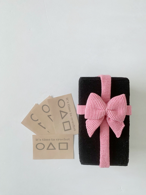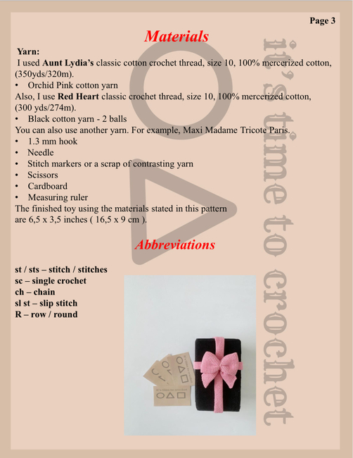 To make Coffin from the Squid Game you will need: I used Aunt Lydia@qs classic cotton crochet thread, size 10, 100% mercerized cotton, (350yds/320m). Orchid Pink cotton yarn Also, I use Red Heart classic crochet thread, size 10, 100% mercerized cotton, (300 yds/274m).Black cotton yarn - 2 ballsYou can also use another yarn. For example, Maxi Madame Tricote Paris., Needle Stitch markers or a scrap of contrasting yarn ScissorsCardboardMeasuring rulerThe finished toy using the materials stated in this pattern are 6,5 x 3,5 inches ( 16,5 x 9 cm ).. Tools required: 1.3 mm.
