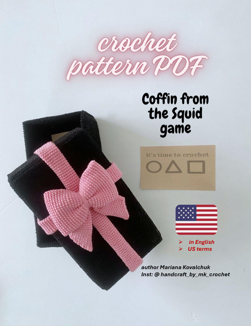 This crochet coffin would make a great gift for fans of the series of the same name. It can be used as a stationery box, a jewelry box, a business card box, or you can store your crochet hooks in it. There are quite a few ways to use it. It would also be a beautiful decoration for your room. I am very pleased with this original creations, as i am a fan of the series " The Squid Game ". If you are interested in such decor/toys, check out my other listings with similar crochet patterns.This crochet pattern is intended for personal use only. But you can sell toys crocheted to this scheme.