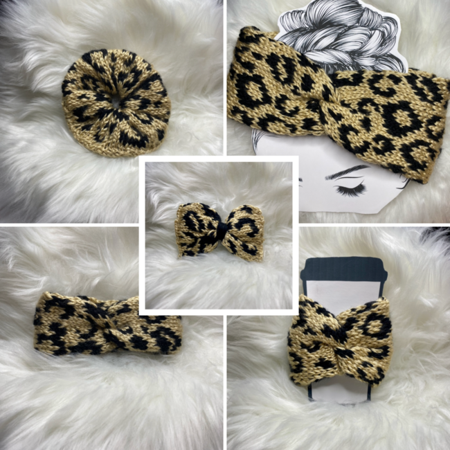 Get the entire leopard print collection for a discounted price. This bundle includes all 5 leopard patterns: headband, scrunchy, baby headband, cup cozy, and bow.