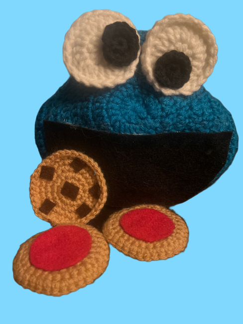 To make Cookie Memory Game with Blue Monster Pouch you will need: For eyes, For eyes, For head, For cookies, Black felt for the smileBrown felt for chocolate chipsUp to 14 different colors of felt for the matching colors on the cookies, 8 inch zipper that matches the blue of your head yarn and matching embroidery thread., If you choose you may use thread and a needle to sew on the felt pieces. You will need a needle and matching threads for each felt color., Non toxic Fabric Glue.. Tools required: 4mm hook, Yarn needle.
