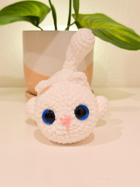To make Cookie the Splooting Cat you will need: Around 1/10 skein of Skinny Chenille Yarn - but this varies based on the yardage of the yarn you are using. Yardage: 524 yd, A strand of Skinny Chenille Yarn (or embroidery thread) to use for the nose., Polyester Stuffing, Sinker eyes or Safety eyes. Tools required: I used a 3.5 mm hook, but you can use whatever size you want! (Keep in mind this will change the measurements of the plushie), Plastic Sewing Needles.