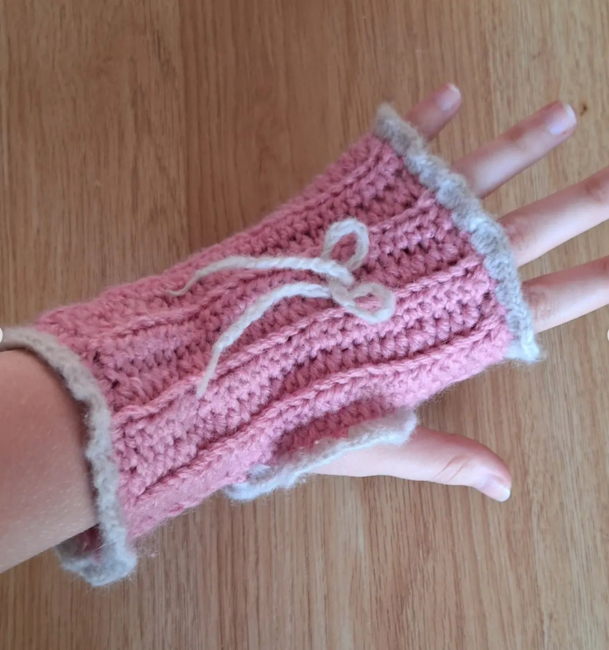 Made By Indi designed the Coquette Fingerless Gloves pattern. Find more of their patterns on their Ribblr shop page.