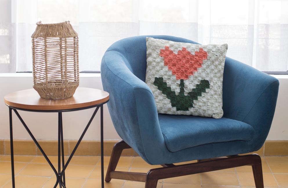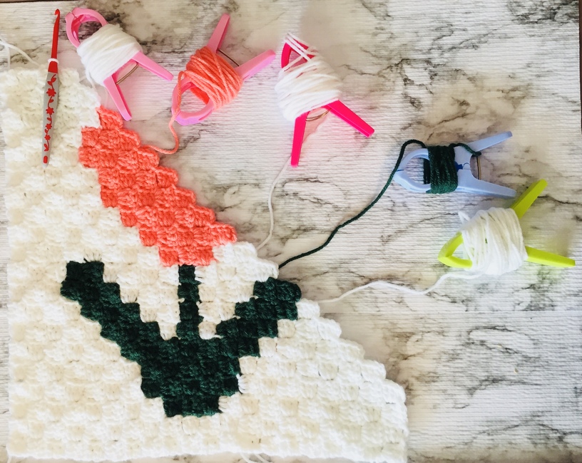 It is made using Classic C2C crochet, which uses chain stitches and double crochets. It also involves colors changes.