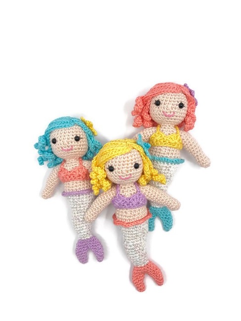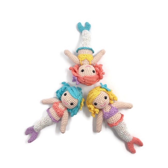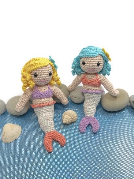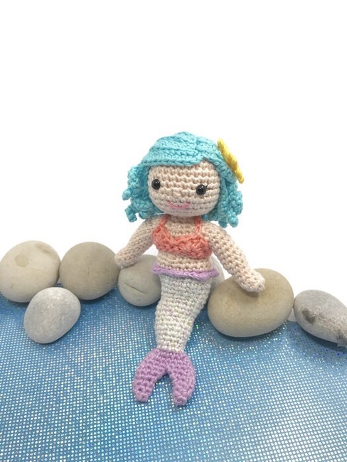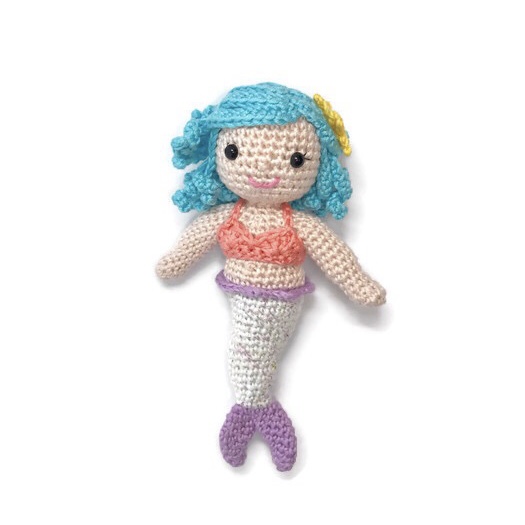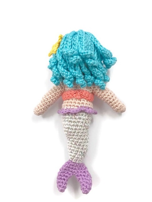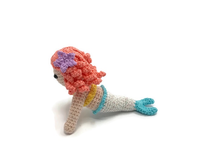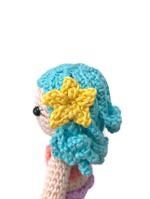 Say Hello to Cordelia the mermaid, she spends all her time protecting her ocean friends and taking care of them when they are sick. Cordelia is an amigurumi mermaid doll wearing a bikini top and a starfish in her hair.